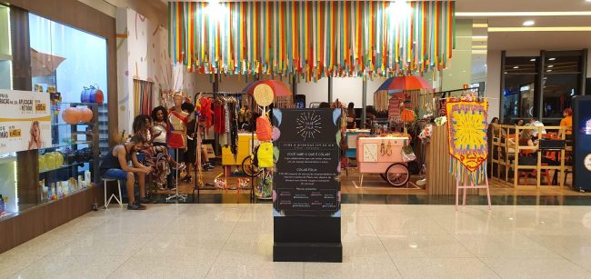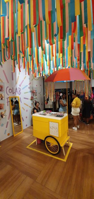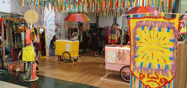 Foi preciso criar, conceituar e transformar um espaço para ser a feira de peças selecionadas Colab Folia para o Rio Plaza Niterói, com peças exclusivas para o Carnaval de 2020: um espaço alegre, divertido e alto astral como o Carnaval do Rio! Extraímos o conceito estético do carnaval de rua do Rio com os famosos carrinhos de ambulantes, com direito a estandarte.