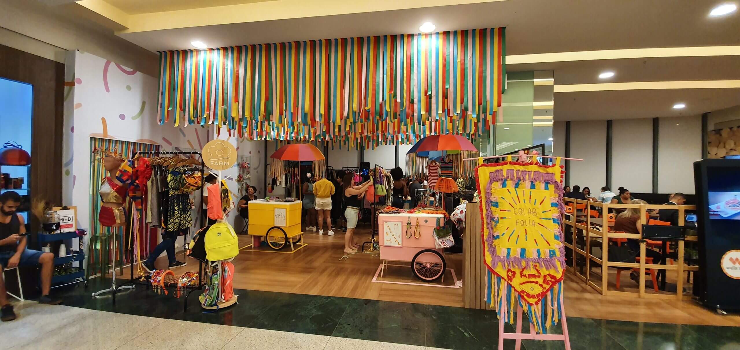 Foi preciso criar, conceituar e transformar um espaço para ser a feira de peças selecionadas Colab Folia para o Rio Plaza Niterói, com peças exclusivas para o Carnaval de 2020: um espaço alegre, divertido e alto astral como o Carnaval do Rio! Extraímos o conceito estético do carnaval de rua do Rio com os famosos carrinhos de ambulantes, com direito a estandarte.