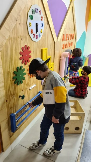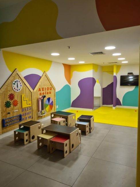 Pensando nos estímulos sensoriais dos pequenos, desenvolvemos especialmente para o shopping Fashion Mall, um espaço colorido e divertido com painéis sensoriais, mesinhas para workshops e espaço de leitura. Tudo com bastante cor e textura para as crianças se divertirem!