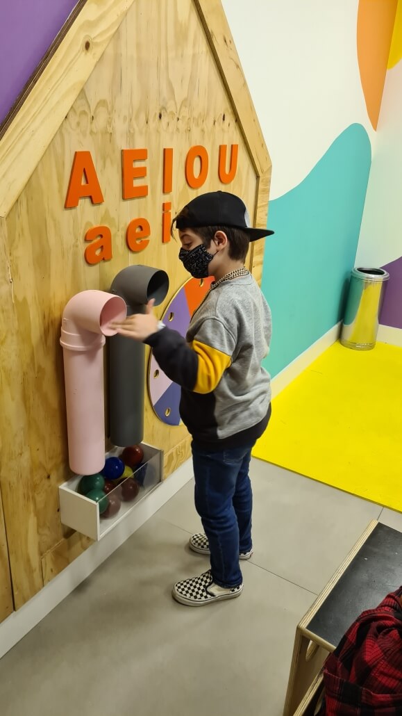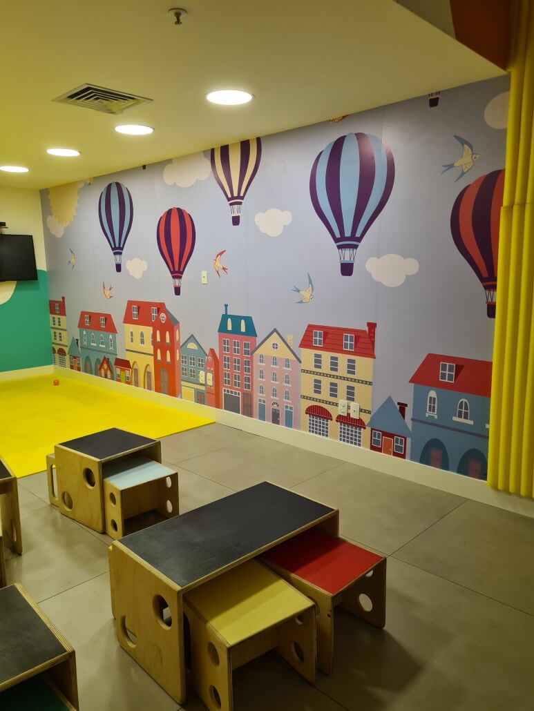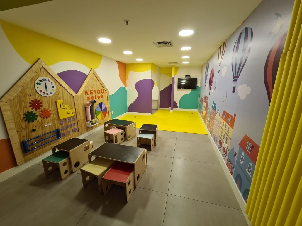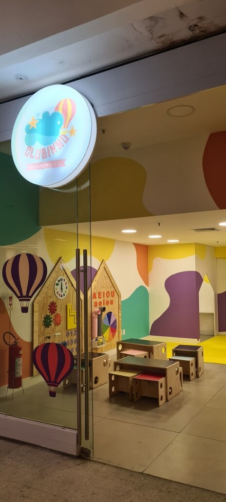 Pensando nos estímulos sensoriais dos pequenos, desenvolvemos especialmente para o shopping Fashion Mall, um espaço colorido e divertido com painéis sensoriais, mesinhas para workshops e espaço de leitura. Tudo com bastante cor e textura para as crianças se divertirem!