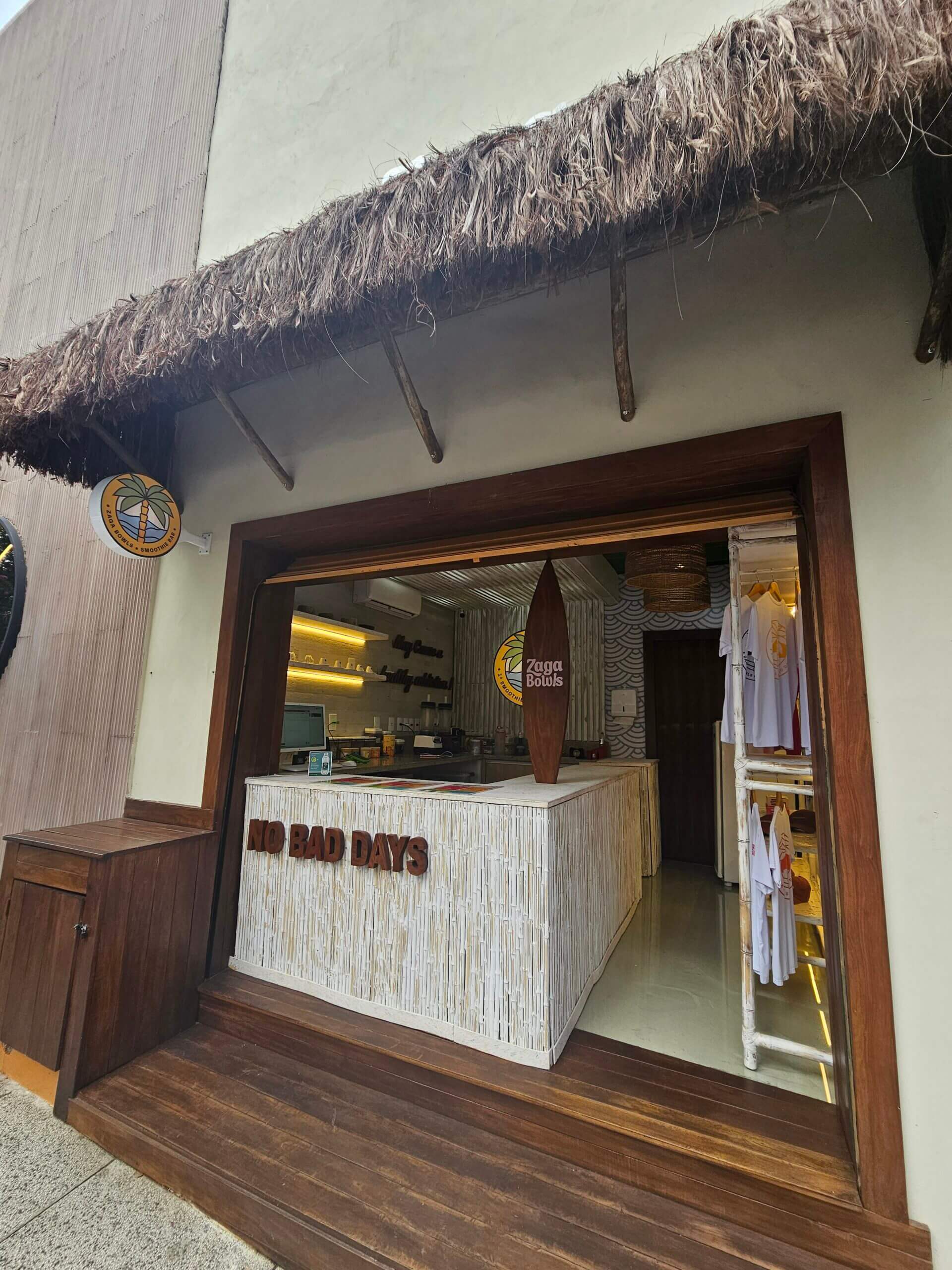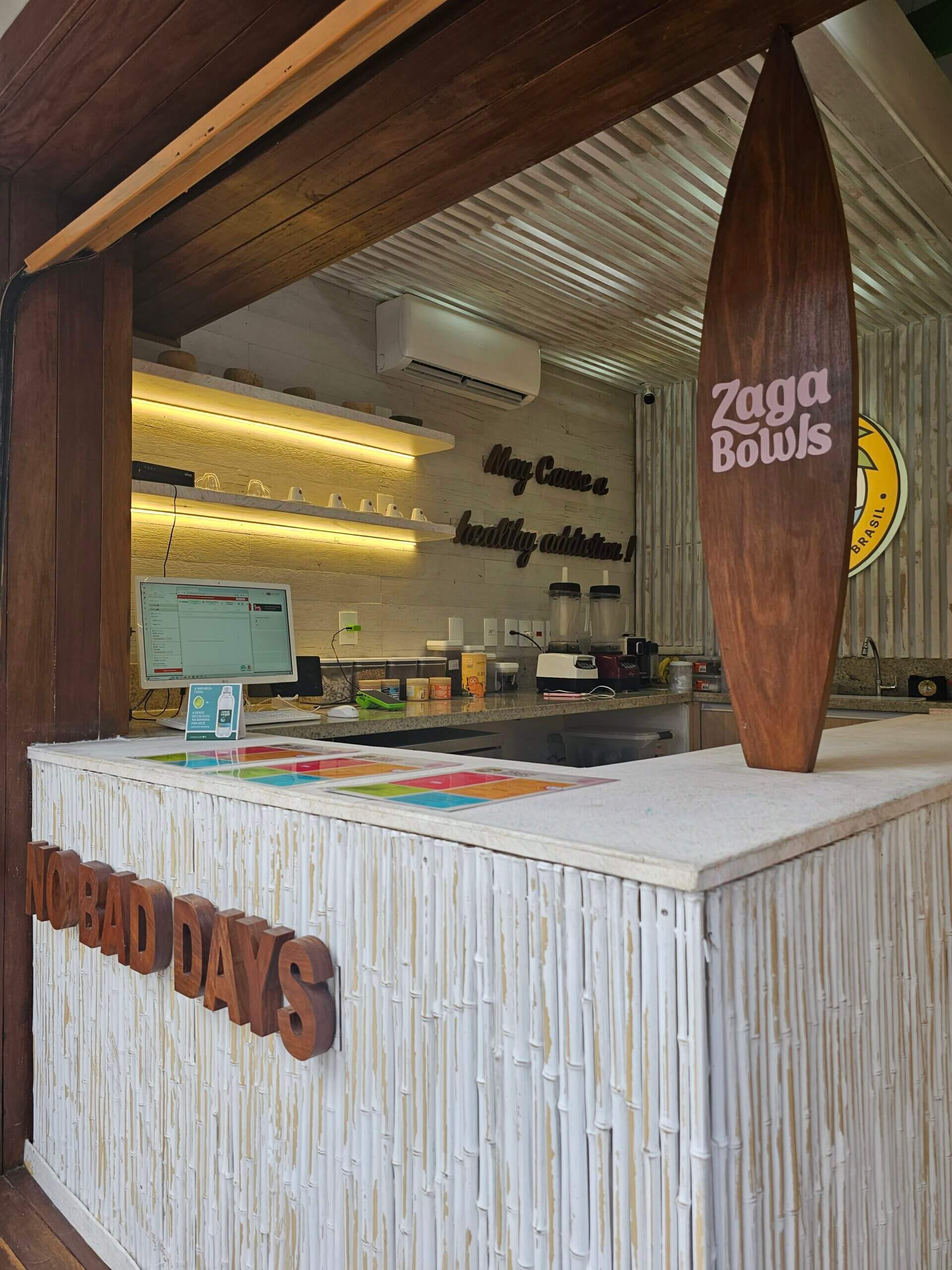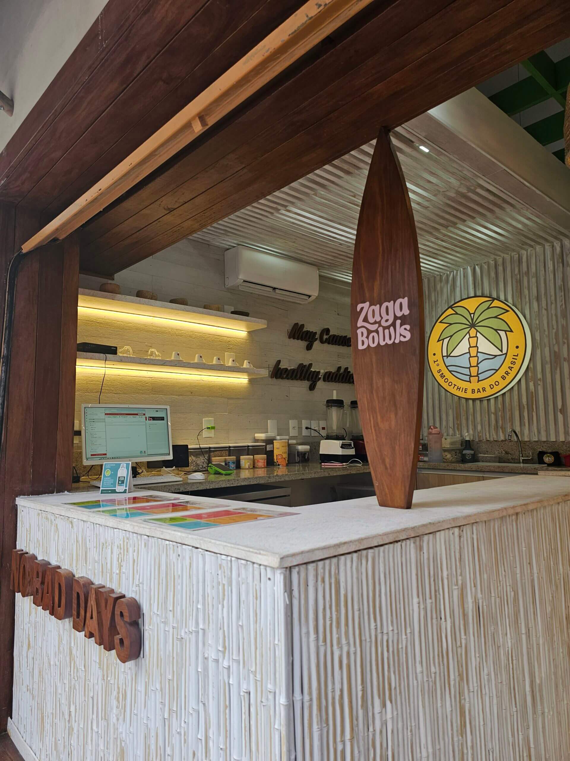 O Zaga Bowls, pioneiro no Brasil como smoothie bar, oferece uma experiência de refeição inspirada no lifestyle da Indonésia, perfeitamente alinhada com o clima brasileiro por ser leve, refrescante e super nutritiva. Nosso projeto trouxe o conceito “da praia para a cidade”, criando uma atmosfera leve e acolhedora dentro do dia a dia agitado da cidade de São Paulo. Utilizamos revestimentos naturais como bambu, piaçava e madeira, e adicionamos um piso de areia, que evoca a sensação única de “pisar na praia”, proporcionando um ambiente que conecta os clientes com a natureza e a tranquilidade da vida praiana. Para abraçar o conceito de sustentabilidade, um atributo importante da marca, incorporamos plástico reciclado nos tampos do balcão e prateleiras da loja, reforçando o compromisso do Zaga Bowls com o meio ambiente.