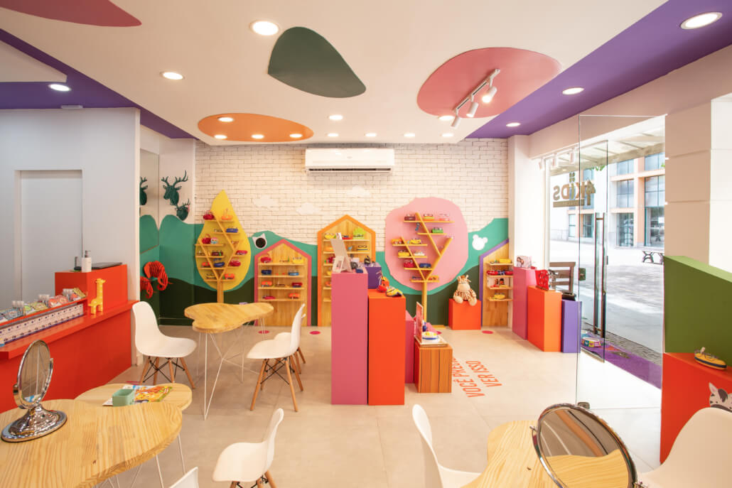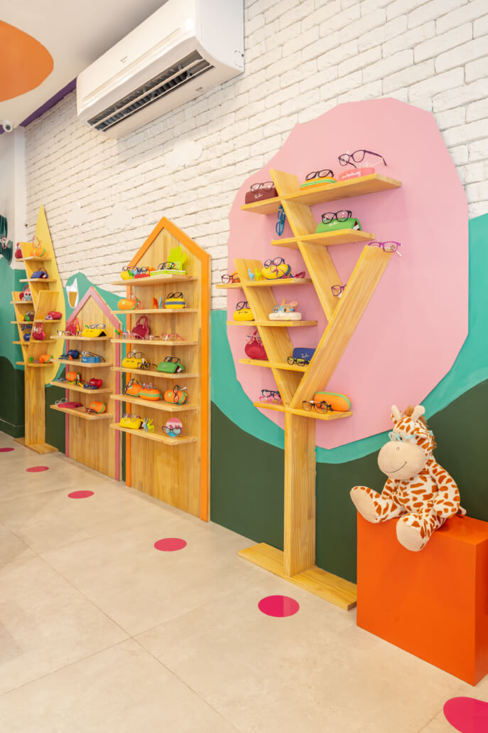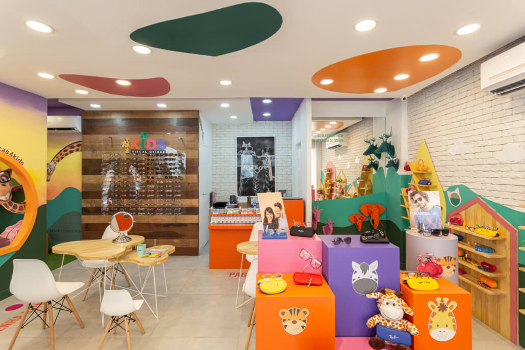 Projeto comercial feito para loja 4 Kid’s no Shopping Downtown. Projetada com base no neuromarketing e comportamento do consumidor, a loja foi projetada com as cores da identidade visual e um storytelling seguindo o mascote da loja, a girafinha! Com expositores em forma de casinha, animais em 3D, totens com texturas para posicionamento estratégico dos produtos, tudo seguindo uma linha orgânica natural da floresta! Com direito a árvore da customização, onde os pequenos podem personalizar seus óculos e uma casinha instagramável para brincar e tirar fotos, com a pintura artística de Wallace Farias, que traz um degradê do pôr do sol.