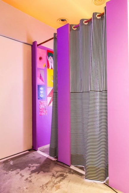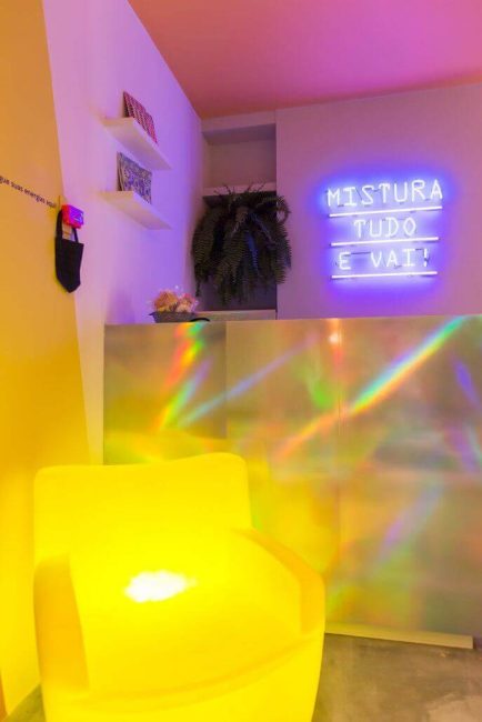 Para o projeto comercial de arquitetura que desenvolvemos para a Garimppo Rio Sul, a Unpack apostou no negrito (cores fortes) e no contraste para um visual ousado e com impacto. Usamos a própria estrutura do espaço para criar o blocado e trabalhamos com a diagonalização dos elementos do projeto.