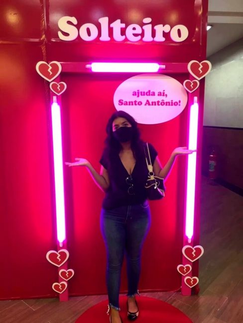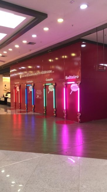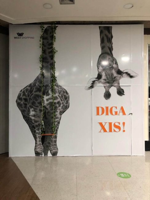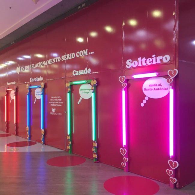 Desenvolvemos tapumes interativos e instagramáveis para Dia dos Namorados para ser palco de brincadeiras entre casais, com frases para os casados, solteiros, namorados ou enrolados, e para vacância do shopping um tapume de girafa interativo.