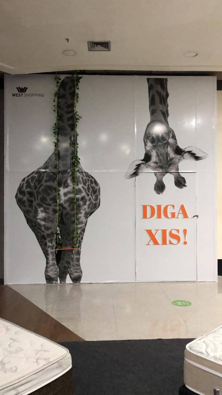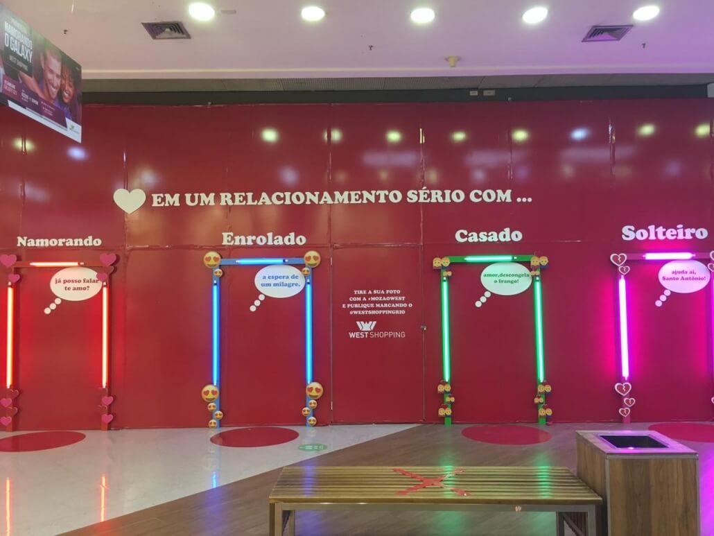 Desenvolvemos tapumes interativos e instagramáveis para Dia dos Namorados para ser palco de brincadeiras entre casais, com frases para os casados, solteiros, namorados ou enrolados, e para vacância do shopping um tapume de girafa interativo.